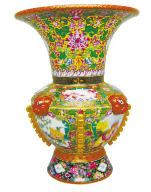 雍正御制琺瑯彩瓷出戟尊。上下四道開光,其中肩部四開光為胭脂彩和藍料彩山水畫;腹部四開光為花鳥和西洋人物。此瓷可謂集燒造工藝、繪畫藝術(shù)、捏塑藝術(shù)等于一體的琺瑯彩瓷藝術(shù)精品,為國內(nèi)外所罕見。