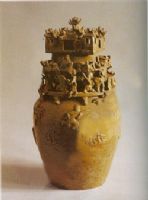 頂部為一建筑群,中間系一懸山頂建筑,四角各立一望樓。中部堆塑形態(tài)各異的人物。下部呈罐形,其上附貼牛羊等動(dòng)物。