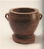罐作斂口,平唇,簡腹向下內(nèi)收,平底。器型特殊,腹上部對稱地置有兩耳,并飾弦紋三道。施黑釉,毗近底部露胎,罐放置在一圓形瓷質(zhì)墊座上,墊座四周劃飾斜直線。