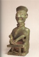 以陶俑來代替人殉葬的風(fēng)氣大約開始於春秋戰(zhàn)國(guó)時(shí)期,秦漢時(shí)期尤為盛行,此陶俑身著立領(lǐng)右袵長(zhǎng)袍,綰袖操刀跽坐案前,正忙於切割。其眉飛色舞、忍俊不禁之態(tài)將內(nèi)心的喜悅盡皆顯露無遺。