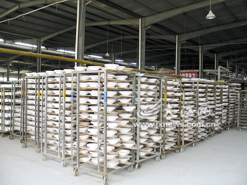 堆放在坯架上還來不及進(jìn)窯的瓷坯。