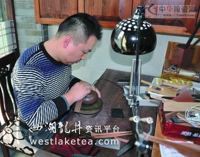 “吾生也有涯,而知也無涯。”這是翟喈喜歡的一句格言。翟喈喜愛讀書,平時經(jīng)常閱讀各種書籍,特別是紫砂大師的文章,以此來豐富自己的創(chuàng)作理念和藝術(shù)修養(yǎng),為自己更好地創(chuàng)作打下基礎(chǔ)。他的文風(fēng)優(yōu)美,善于旁征博引,曾多次發(fā)表論文,刊登于《江蘇陶瓷雜志》等刊物。翟喈沉穩(wěn)、敦厚、內(nèi)斂,話不多卻很隨和親切。他對我們說,現(xiàn)在以做傳統(tǒng)壺、仿壺為主,自己創(chuàng)作的壺較少。先要把基本功打扎實(shí)了才能更好地創(chuàng)造,先仿再創(chuàng)。做壺切記浮躁,關(guān)鍵要用心、專注。這是他做壺的態(tài)度。翟喈的工作室“藝石坊”并不大,卻是他創(chuàng)作、制作紫砂壺的一片天地。每天沉醉在紫砂的藝術(shù)世界中,廢寢忘食也時有發(fā)生。