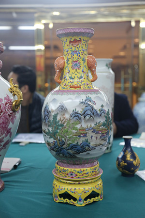 在擺滿各種顏色、不同外觀瓷器的大方桌上,記者看到一只可以轉(zhuǎn)動(dòng)的瓷瓶。崔紀(jì)文介紹說,這是乾隆粉彩山水紋象耳盤口轉(zhuǎn)心套瓶,由瓶體、底座和內(nèi)心三部分組成,高60厘米,口徑16厘米,底徑18厘米。據(jù)史料記載,乾隆八年,御用督陶官唐英為博得乾隆皇帝的歡心,在景德鎮(zhèn)御窯場(chǎng)創(chuàng)燒成功了我國古代制瓷史上設(shè)計(jì)精巧、工藝復(fù)雜的三種瓷器樣式:套瓶、交泰瓶和轉(zhuǎn)心瓶,并奏請(qǐng)乾隆皇帝御審。其中,工藝最為復(fù)雜的正是將套瓶、交泰瓶和轉(zhuǎn)心瓶幾種樣式結(jié)合的轉(zhuǎn)心套瓶,此種轉(zhuǎn)心套瓶巧奪天工,費(fèi)時(shí)、費(fèi)工、費(fèi)料,更不易仿制,連乾隆皇帝也覺得其工藝過于復(fù)雜,在唐英的奏折上批復(fù)“不必照隨常瓷器一樣多燒”,由此可見其珍貴程度。