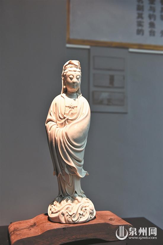 在德化金煌陶瓷博物館,“再現(xiàn)經(jīng)典——明代渡海觀音作品展”持續(xù)進行中。一尊高51.8厘米的渡海觀音端莊大方,面露慈祥,衣紋飄逸,動靜結(jié)合,比例勻稱,做工精細,令參觀者嘖嘖稱奇。原來,這是一尊具有典型的何朝宗風格的渡海觀音。