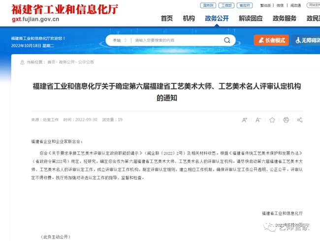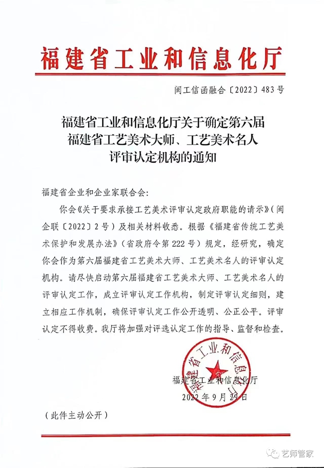 2022年9月29日,福建省工業(yè)和信息化廳發(fā)布關(guān)于確定第六屆福建省工藝美術(shù)大師、工藝美術(shù)名人評(píng)審認(rèn)定機(jī)構(gòu)的通知。