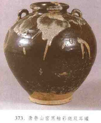 唐至元代瓷窯。窯址在河南魯山段店。唐代南卓《羯鼓錄》有“不是青州石墨,即是魯山花瓷”的記載,說明唐代魯山燒造的花瓷很有名。從采集的標(biāo)本來看,“花瓷”是黑釉或褐釉上帶白、月白等淺色斑紋裝飾的器物,器形有拍鼓、瓶、壺、罐、碗、盤等。宋、金時(shí)窯場(chǎng)擴(kuò)大,燒瓷品種豐富,裝飾方法多種多樣。白釉器物有爐、罐、碗、缽等。白釉上繪褐彩的點(diǎn)、圈點(diǎn)、花卉等幾類紋飾。其中點(diǎn)紋排列方式有橫向形、花朵形和三角形等。另有白釉劃花、紋飾有荷葉、花草紋,器物為碗、枕,有以多組直線、曲線相間豎向排列組成的紋飾,有珍珠地劃花、還有粗線紋的缽,用黑釉、醬釉裝飾口沿的白釉碗。黑釉器物有線紋裝飾,有滿線與兩線一組兩種。有六角紋盤,盤中心素胎上有點(diǎn)彩花朵裝飾。還有醬彩裝飾的碗。醬釉有碗、罐等器物,青釉印花的幾種紋飾與臨汝等窯相近。此外,紅綠彩碗、三彩凸雕蓮瓣?duì)t、綠釉獅形枕、劃花枕、褐黃釉劃花枕都具有魯山窯特色。(見圖373)