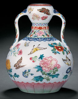 圖片說明:清乾隆粉彩花蝶紋如意耳葫蘆尊