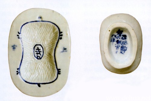 “象牙白”釉龜粿印,康熙五十八年(1719年),寬8厘米,長(zhǎng)11.5厘米,龜粿印用青花點(diǎn)綴,釉水瑩潤(rùn),宛如凝脂,底部用青花銘有“康熙伍拾八年吉日 寶”等字樣。