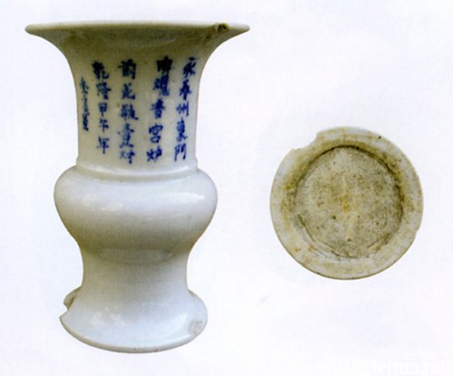 白釉泛青鳳尾尊,乾隆甲午年(1774年),高18.5厘米,口徑13厘米,瓶圓口外撇,底內(nèi)凹圈足,白釉,微泛青色,器壁青花銘有“永春州東門內(nèi)觀音宮爐前花瓶壹對乾隆甲午年季長置’等字樣。