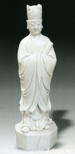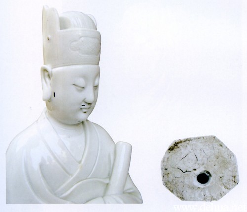 釉色白中閃黃,呈象牙色,溫潤細(xì)膩。文官頭戴官帽,丹鳳眼,鬢須以真毛填補,雙手合攏于衣袖內(nèi),作執(zhí)笏板狀,神態(tài)閑然自若,立于臺上,精雕細(xì)刻,線條圓潤、流暢、洗練。底部僅留一小洞,系以整塊瓷泥捏塑而成,胎體渾厚,有窯裂。