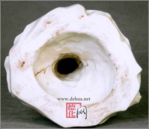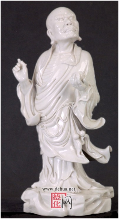 德化窯又稱建窯,意為福建之窯,但不是指宋代福建北部建州所產(chǎn)黑瓷建窯。德化縣位于福建中部戴云山脈,歷史上與江西景德鎮(zhèn)、湖南醴陵并稱為中國南方三大瓷都。明代中葉,白瓷生產(chǎn)成為德化瓷業(yè)的主流,明代晚期到達(dá)了頂峰,特別是雕塑造像藝術(shù)品,其代表人物為何朝宗。何氏的生卒年代應(yīng)在明代萬歷前后,何氏作品,現(xiàn)流行在世的有觀音、達(dá)摩、文昌帝君等。
