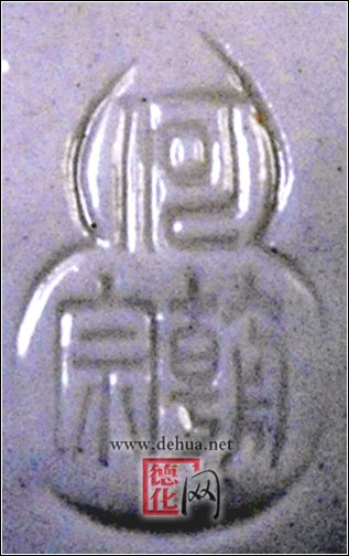 達(dá)摩立像(見圖一),高30厘米,底徑11—12厘米。胎白質(zhì)細(xì),釉面滑潤,白中閃黃,呈奶白色,胎體厚重堅(jiān)實(shí)。光頭,顴骨立聳,兩眼暴突,濃眉闊鼻。兩耳內(nèi)中,皆有穿孔,以利透氣焙燒,眉毛鬢須皆卷曲,雙耳下垂幾至肩部,最突出的是兩顆門牙外露。上胸袍領(lǐng)外翻,衣裳下擺向右翻卷,喉結(jié)、胸肌、指甲、筋腱皆栩栩如生。立像中空,座底邊緣寬2厘米,內(nèi)壁呈半弧形,上部收斂成圓孔,孔徑2厘米,座內(nèi)滿釉,座底露胎。整個塑像赤足而立,身材偉岸,容貌威嚴(yán),氣度軒昂,一手托缽,一手自然指向天外,一派圣僧形象。另一面腰圓背闊,雄渾矯健,背部鈐葫蘆形陽文篆書“何朝宗”三字。ㄒ妶D二)。