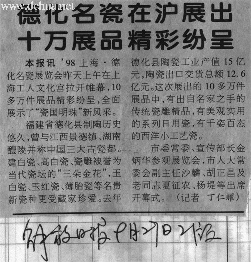 本報(bào)訊’98上海·德化名瓷展覽會(huì)昨天上午在上海工人文化宮拉開帷幕,10多萬件展品精彩紛呈,全面展示了“瓷國明珠”新風(fēng)采。