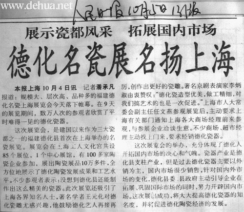 這次展覽會,是建國以來作為三大瓷都之一的福建德化縣首次在上海舉辦的名瓷展覽。展覽會在上海工人文化宮共設(shè) 85個展位,1個中心展館,有l(wèi)00多家陶瓷企業(yè)參加,展出陶瓷展品l0萬多件,全方位地展示了德化陶瓷發(fā)展成果和工藝水平。不少參觀者表示:沒想到德化縣還能制作出這么精美的瓷器。此次展覽還吸引了上海各界知名人士,著名學(xué)者王元化對德化瓷雕尤感興趣,他鼓勵德化藝人再接再厲,創(chuàng)作出更好的瓷雕。著名京劇表演家李炳淑由衷贊嘆:“德化瓷造型優(yōu)美,做工精細(xì),對我們搞藝術(shù)的也是一次促進(jìn)。”上海市人大常委會副主任任文燕參觀展覽后,主動要求上海有關(guān)部門通知上海各大商場經(jīng)理前來參觀,與參展企業(yè)洽談生意。不少商場、超市經(jīng)理主動找上門來,要求經(jīng)銷德化瓷器。