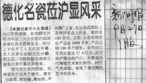 德化地處泉州西部,其陶瓷技藝成熟于唐代,素有“白如雪、明如鏡、薄如紙、聲如磬”之譽(yù),在全國或國際上各種評獎會上獲金、銀質(zhì)獎160多次。目前,全縣有陶瓷生產(chǎn)企業(yè)1000多家,產(chǎn)品遠(yuǎn)銷130多個國家,去年出口交貨總值達(dá)12.6億元。此次來滬展出的產(chǎn)品,大都是當(dāng)代陶瓷藝術(shù)家的新作,時(shí)代氣息濃郁,體現(xiàn)了德化陶瓷藝術(shù)的風(fēng)采。