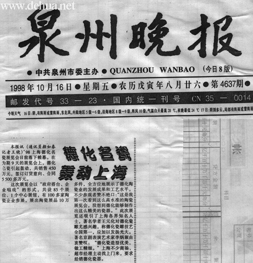 這次展覽會以“政府搭臺、企業(yè)唱戲”的形式,共設85個展位、1個中心展館,有100多家陶瓷企業(yè)參展,展出陶瓷展品10萬多件,全方位地展示了德化陶瓷業(yè)的發(fā)展成果和工藝水平。不少參觀者贊不絕口:“這是我第一次看到這么高水準的陶瓷展覽會,沒想到德化能夠制作出這么精美的瓷器。”此次展覽還吸引了上海各界知名人士,著名學者王元化對德化瓷雕尤感興趣,稱德化瓷雕技藝全國第一,應加以發(fā)揚光大。著名京劇表演藝術家李炳淑由衷贊嘆:“德化瓷造型優(yōu)美,做工精細。”上海不少商場、超市經理主動找上門來,要求經銷德化瓷器。
