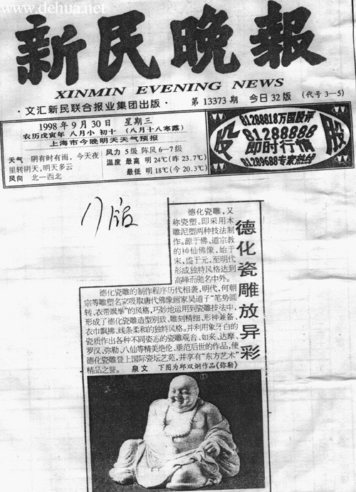并利用象牙白的瓷質作出各種不同姿態(tài)的瓷雕觀音、如來、達摩、羅漢、彌勒、八仙等精美絕倫、垂范后世的作品,使德化瓷雕登上國際瓷壇藝苑,并享有“東方藝術”精品之譽。 泉文 下圖為邱雙炯作品《彌勒》