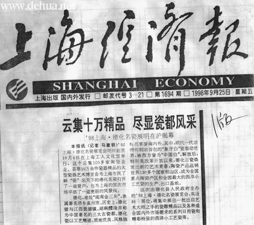 這次由德化縣人民政府主辦的,98上海·德化名瓷展覽會,共設(shè) 86個展位,將集中展出一批出自藝術(shù)大師之手的瓷雕精品以及各種適備國內(nèi)外市場需求的系列日用瓷和精彩紛呈的西洋小工藝瓷等。