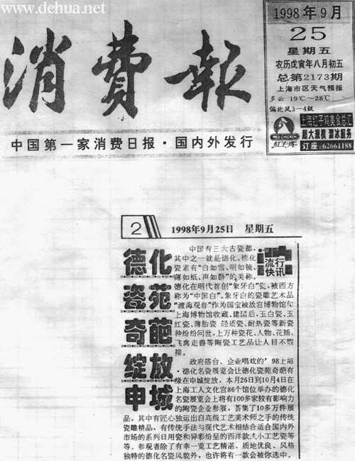 政府搭臺、企業(yè)唱戲的’98上海·德化名瓷展覽會讓德化瓷苑奇葩有緣在申城綻敬,本月26日到l0月4日在上海工人文化宮86個館位舉辦的德化名瓷展覽會上將有100多家較有影響力的陶瓷企業(yè)參展,薈集了lO多萬件展品,其中有匠心獨運出自高級工藝美術師之手的傳統(tǒng)瓷雕精品,有傳統(tǒng)手法與現(xiàn)代藝術相結合適合國內(nèi)外市場的系列日用瓷和異彩紛呈的西洋款式小工藝瓷等等。參觀者除了有幸一覽工藝精湛、質(zhì)地優(yōu)良、風格獨特的德化藝名瓷風貌外,也許將有一款會被你選中。