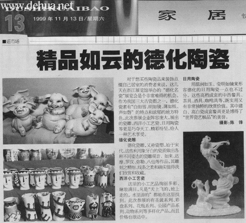 對(duì)于想買些陶瓷品來(lái)裝飾點(diǎn)綴自己居室的消費(fèi)者來(lái)說(shuō),這幾天在浙江展覽館舉辦的“德化名瓷”展覽會(huì)是個(gè)非常難得的機(jī)會(huì)。作為我國(guó)三大古瓷都之一,德化瓷素有“自如雪、明如鏡、薄如紙、聲如磬”的特點(diǎn)和濃郁的地方特色,此次參展企業(yè)陣容龐大,展出的瓷雕、西洋小工藝瓷、日用陶瓷等更是巧奪天工、精彩紛呈,給人一種藝術(shù)享受。
