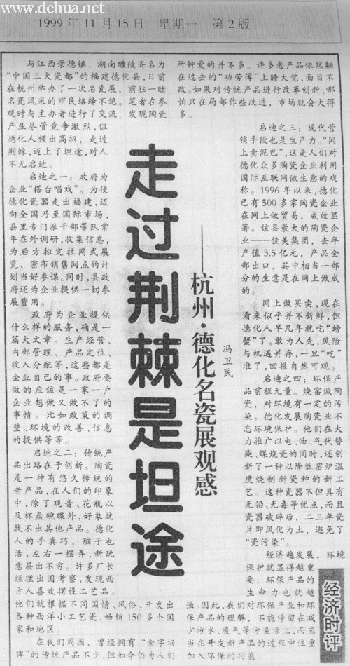與江西景德鎮(zhèn)、湖南醴陵齊名為“中國三大瓷都”的福建德化縣,日前在杭州舉辦了一次名瓷展,前往一睹名瓷風(fēng)采的市民絡(luò)繹不絕。筆者在參觀時與主辦者進(jìn)行了交流,發(fā)現(xiàn)陶瓷產(chǎn)業(yè)盡管競爭激烈,但德化人頻出高招,走過荊棘,邁上了坦途,對人不無啟迪。