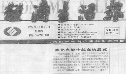 杭城的瓷器愛(ài)好者,近期可在家門(mén)口一睹來(lái)自瓷都明珠福建德化的名瓷了。從今日起,由德化縣政府主辦的’99杭州德化名瓷展覽會(huì)在浙江省展覽館開(kāi)幕,展覽會(huì)為期5天。