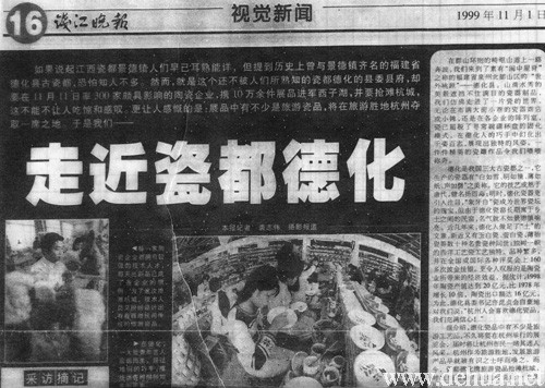 如果說起江西瓷都景德鎮(zhèn)人們早已耳熟能詳,但提到歷史上曾與景德鎮(zhèn)齊名的福建省德化縣古瓷都,恐怕知人不多。然而,就是這個還不被人們所熟知的瓷都德化的縣委縣府,卻要在11月11日率300家世頗具影響的陶瓷企業(yè),攜10萬余件展品進軍西子湖,并要搶灘杭城,這不能不讓人吃驚和感嘆。更讓人感概的是:展品中有不少是旅游瓷品,將在旅游勝地杭州奪取一席之地。于是我們——走近瓷都德化