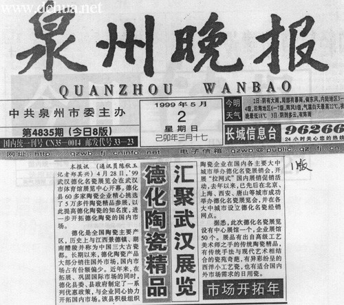 本報訊 (通訊員陳秋玉記者鄭其興)4月28日,’99武漢德化名瓷展覽會在武漢市體育館展覽中心開幕。德化縣60多家陶瓷企業(yè)精心挑選了5萬多件陶瓷精品參展,以此提高德化陶瓷的知名度,進(jìn)一步開拓德化陶瓷的國內(nèi)市場。