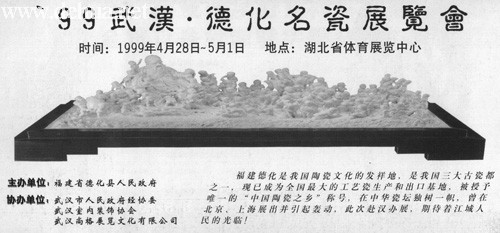 福建德化是我國(guó)陶瓷文化的發(fā)祥地,是我國(guó)三大古瓷都之一,現(xiàn)已成為全國(guó)最大的工藝瓷生產(chǎn)和出口基地,被授予唯一的“中國(guó)陶瓷之鄉(xiāng)”稱號(hào),在中華瓷壇獨(dú)樹一幟,曾在北京、上海展出并引起轟動(dòng),此次赴漢辦展,期待著江城人民的光臨!