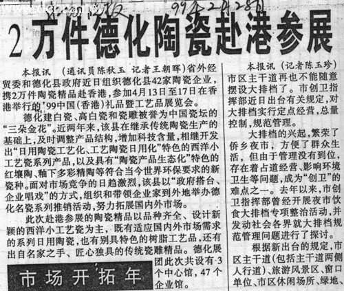 本報(bào)訊(通訊員 陳秋玉 記者 王朝暉) 省外經(jīng)貿(mào)委和德化縣政府近日組織德化縣42家陶瓷企業(yè),攜2萬件陶瓷精品赴香港,參加4月13日至17日在香港舉行的’99中國(香港)禮品暨工藝品展覽會。