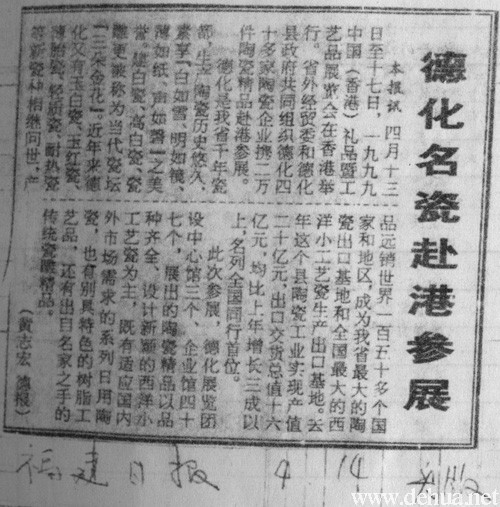 德化是我省千年瓷都,生產(chǎn)陶瓷歷史悠久,素享『白如雪、明如鏡、薄如紙、聲如磬』之美譽(yù)。建白瓷、高白瓷、瓷雕更被稱為當(dāng)代瓷壇『三朵金花』。近年來德化又有玉白瓷、玉紅瓷、薄胎瓷、輕質(zhì)瓷、耐熱瓷等新瓷種相繼問世,產(chǎn)品遠(yuǎn)銷世界一百五十多個(gè)國(guó)家和地區(qū),成為我省最大的陶瓷出口基地和全國(guó)最大的西洋小工藝瓷生產(chǎn)出口基地。去年這個(gè)縣陶瓷工業(yè)實(shí)現(xiàn)產(chǎn)值二十億元,出口交貨總值十六億元,均比上年增長(zhǎng)三成以上,名列全國(guó)同行首位。