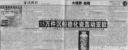 據(jù)悉,拍賣會(huì)將于今年11月17日至25日在存放瓷器的倉庫附近搭起的大帳篷中進(jìn)行。拍賣行將把這些德化陶瓷分成若干批進(jìn)行拍賣。主辦單位稱,這是有史以來規(guī)模最大的拍賣會(huì)。