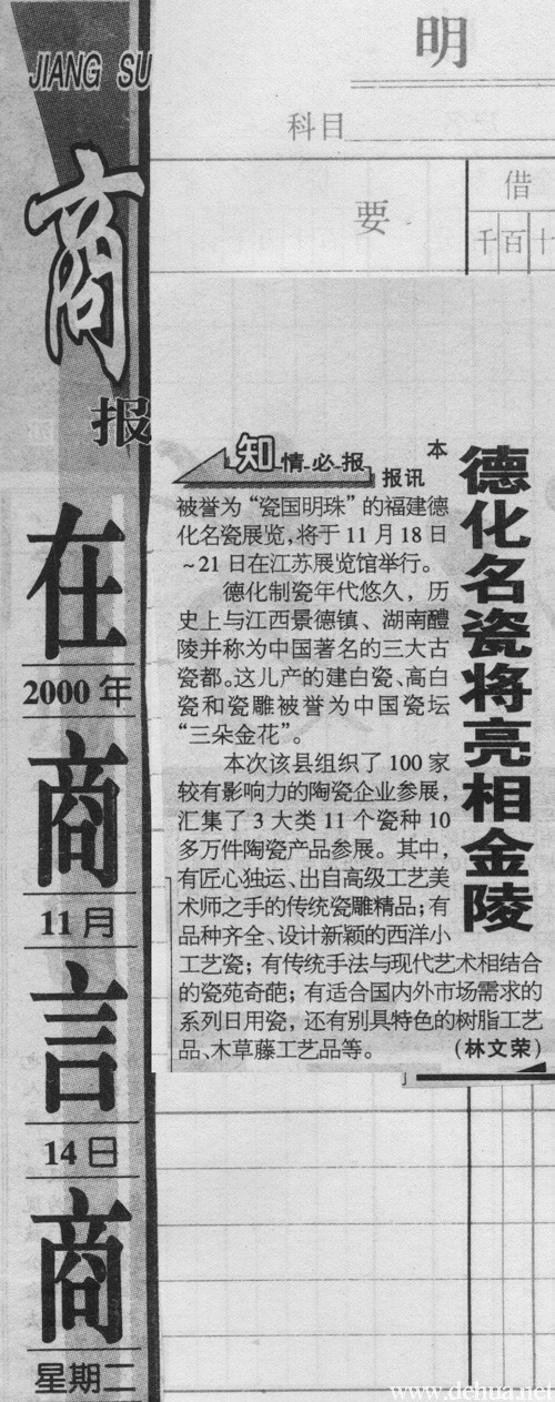 被譽(yù)為“瓷國明珠”的福建德化名瓷展覽,將于11月18日~21日在江蘇展覽館舉行。