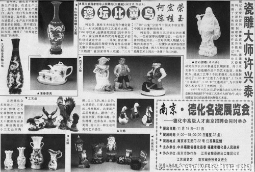 據(jù)資料記載:由于受、瓷土原料和燒窯技術的限制,福建德化瓷雕作品高度歷來不能超過1米。然而,德化縣德藝瓷雕研究所所長許興泰通過長期探索,終于攻克制作大型瓷雕作品中的藝術造型、坯釉配方、燒成工藝等3個技術難關、先后燒制成功了1.05米“立蓮十八手觀音”、1.75米“立龍觀音”、1.85米“立蓮觀音”,為中國陶瓷藝術史寫下了光輝的一頁。