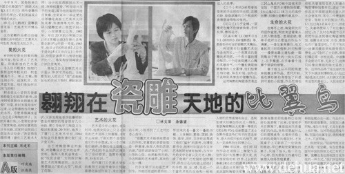 由、于對(duì)陶瓷事業(yè)的癡愛(ài),對(duì)瓷雕設(shè)計(jì)藝術(shù)的追求,使柯、陳兩人有機(jī)會(huì)常在一起“玩泥談瓷”,共同探討陶瓷藝術(shù)的發(fā)展走向,日久生情便碰出“愛(ài)的火花”,結(jié)成了伉儷。