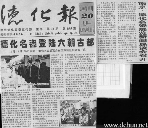 從11月9日開始,《揚子晚報》、《周末報》、《金陵晚報》以整版篇幅,對新近發(fā)現(xiàn)于南海的古沉船和35萬件德化古陶瓷作了詳細報道。11月14日。《揚子晚報》、《金.陵晚報》、《江南時報》、《江蘇商報》、南京電視臺、南京有線電視臺、江蘇人民廣播電臺等江蘇各主要媒體,也對德化名瓷到寧展覽的消息作了報道。各大媒體將在今后一段時間里,對展覽活動作跟蹤報道。(林文榮)