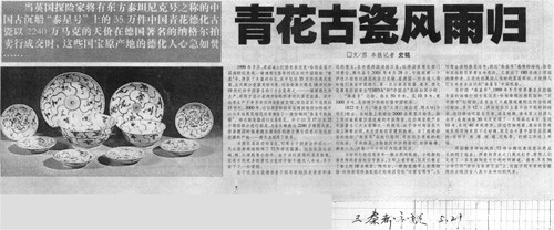 1999年5月,英國海上打撈專家邁克·哈徹在南中國海附近發(fā)現(xiàn)一艘清朝光緒年間沉沒的中國商船“泰星”號,撈獲了大量的珍寶,其中包括35萬件的德化瓷器,且大部分瓷器完好無損。這些瓷器大都是18世紀和19世紀初中國著名的三大古瓷都之…福建德化所生產(chǎn),并用于出口亞洲市場的明清時代青花瓷器。其中也有生產(chǎn)于更早年代的瓷器被發(fā)現(xiàn),有些甚至可追溯到15世紀。2000年,這位英國探險家在德國斯圖加特城中心火車站展覽館花巨資建造了一座仿制的“泰星號帆船樓”,將這批瓷器進行長期展覽。并于11月17日至25日將其部分進行拍賣,總成交額高達2240萬德國馬克,僑居德國的福建德化籍華僑鄭德力博士獲悉后與這些瓷器的產(chǎn)地——德化縣取鑷了聯(lián)系。