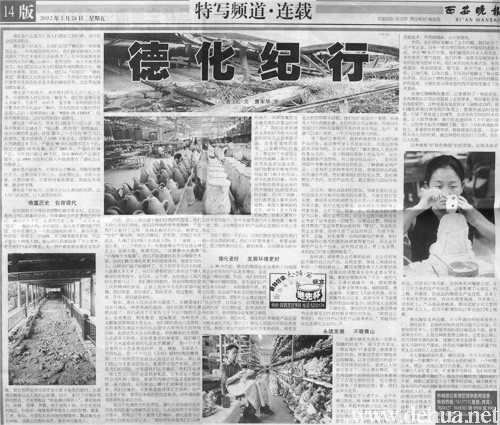 令人感觸很深的是:德化雖是一個(gè)不大的地方,但卻是一個(gè)歌舞升平,安居樂(lè)業(yè)的好地方,一個(gè)時(shí)期以來(lái),周邊一些地區(qū)流行六合彩,不少人深陷其中,而德化人卻忙著上班,忙著靠勞動(dòng)掙錢,他們相信靠勞動(dòng)掙錢是最可靠的了,而這個(gè)可靠的大門(mén)就向他們開(kāi)著。傍晚記者留連于這個(gè)繁華的縣城,城中被稱為母親河的浐溪河倒映著兩岸霓虹閃爍的商店以及消閑購(gòu)物的人們,水波擺動(dòng)把兩岸的幸福抖動(dòng)得流光溢彩,這景象給我們的啟迪太深了:是瓷讓德化這樣美的。