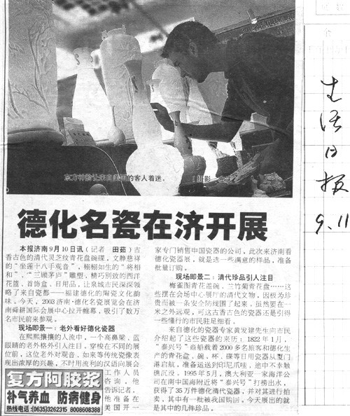 本報濟南9月10日訊(記者 田茹)古香古色的清代靈芝紋青花盤碗碟,文靜慈祥的“坐蓮十八手觀音”,栩栩如生的“將相和”、“三顧茅廬”雕塑,精巧別致的西洋花籃、首飾盒、日用品,讓泉城市民深深領(lǐng)略了來自瓷都——福建德化的陶瓷文化韻味。今天,2003濟南·德化名瓷展覽會在濟南舜耕國際會展中心拉開帷幕,吸引了數(shù)萬名市民前來參觀。