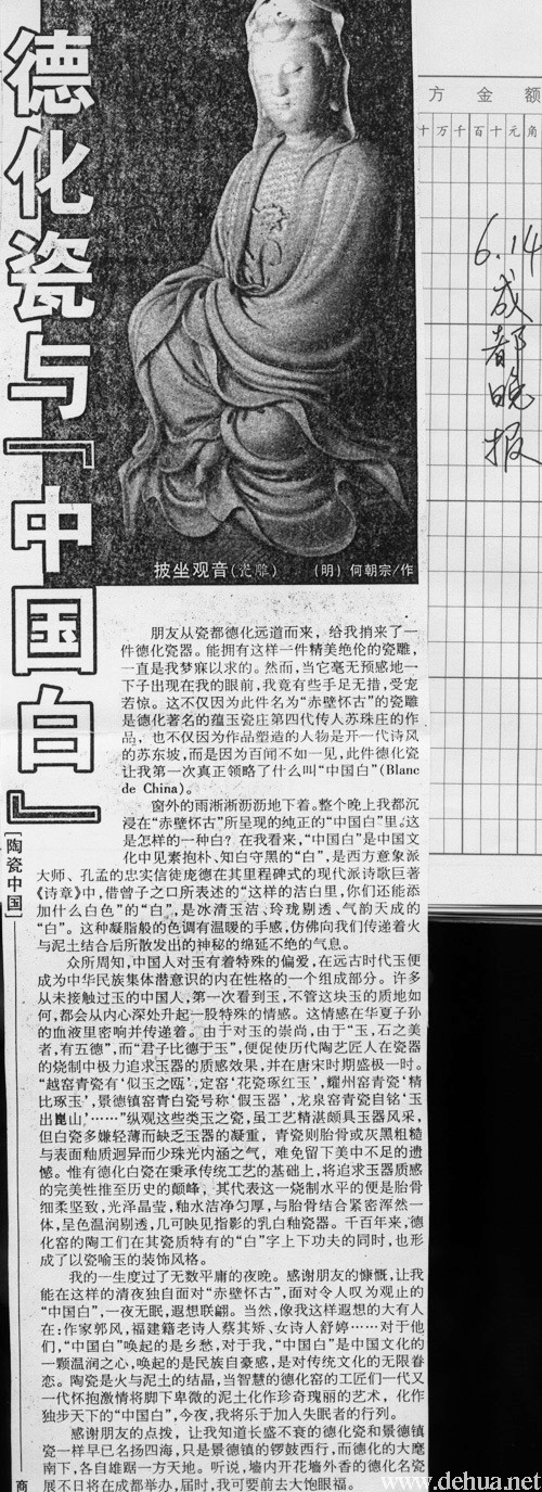 感謝朋友的點(diǎn)撥,讓我知道長(zhǎng)盛不衰的德化瓷和景德鎮(zhèn)瓷一樣早已名揚(yáng)四海,只是景德鎮(zhèn)的鑼鼓西行,而德化的大麾南下,各自雄踞一方天地。聽說,墻內(nèi)開花墻外香的德化名瓷展不日將在成都舉辦,屆時(shí),我可要前去大飽眼福。