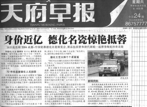 16日起亮相2004成都-中國瓷都德化名瓷展覽會,展品包括曾和清代商船一起葬身海底的青花瓷