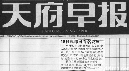 早報訊(記者 楊秀東 實(shí)習(xí)生 李巧鳳)被譽(yù)為“中國瓷都”的福建德化縣,將于16日至20日在蓉舉辦名瓷展覽會,市民可一睹包括建白瓷、高白瓷、瓷雕在內(nèi)的10多萬件名瓷芳容。