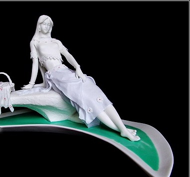 該瓷雕作品由一個美麗的少女坐在月牙泉邊的一塊石塊上棲息,表現(xiàn)了人與大自然和諧的意境。作品造型新穎,線條流暢,體現(xiàn)作品的藝術(shù)美。