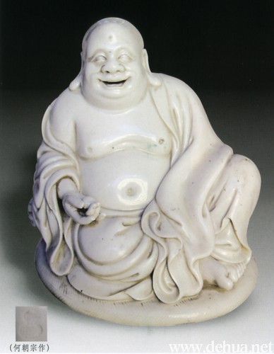 彌勒笑容可掬,雙目炯然有神,右手托珠,盤坐于蒲團之上,寬袍長袖,衣袂圓潤,背鈐有“何朝宗”葫蘆印。釉水溫潤,造型形象生動,令人嘆為觀止。