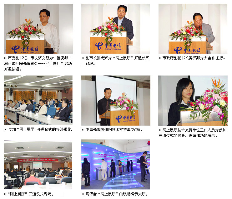 4月18日下午,中國(guó)瓷都"潮州國(guó)際陶瓷博覽會(huì)----網(wǎng)上展廳"開(kāi)通儀式在中國(guó)電信多功能廳隆重舉行,市委副書(shū)記、市長(zhǎng)駱文智,副市長(zhǎng)孫光輝,市政府副秘書(shū)長(zhǎng)黃漢邦,市經(jīng)貿(mào)局局長(zhǎng)魏清潮,市科技局局長(zhǎng)張時(shí)義及相關(guān)領(lǐng)導(dǎo),網(wǎng)上展廳技術(shù)支持單位代表及部分參展企業(yè)代表出席開(kāi)通儀式。 市委副書(shū)記、市長(zhǎng)駱文智親自為中國(guó)瓷都"潮州國(guó)際陶瓷博覽會(huì)----網(wǎng)上展廳"啟動(dòng)開(kāi)通按鈕,副市長(zhǎng)孫光輝為開(kāi)通儀式致辭.詳見(jiàn)下圖: