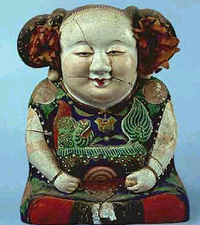 清華大學(xué)美術(shù)學(xué)院副教授 鄒文:大阿福據(jù)說是造型來自于一個(gè)神話傳說,說在江南那一帶有一對(duì)一雌一雄的兩個(gè)神人,像神仙一樣的,他們有一種魅力,這魅力說來特別中國(guó)化,就是他不是很剛勇的那種很神怪的東西,他是很陰柔的一種東西,就是他一笑,敵人就會(huì)被他笑倒,倒在自己的懷抱里頭任自己吞食。所以,他那種笑里頭就含著很強(qiáng)的中國(guó)文化色彩。他就具有一種寬容和一種大度,一種氣象,它對(duì)敵人的這種壓制它是建立在敵人歸順自己,而不必犧牲他的生命。大阿福他一般笑容可掬,但是那后邊是一種征服。