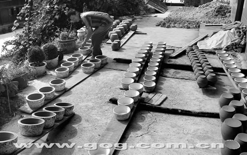 圖:村民金愛(ài)平在晾曬陶瓷產(chǎn)品。