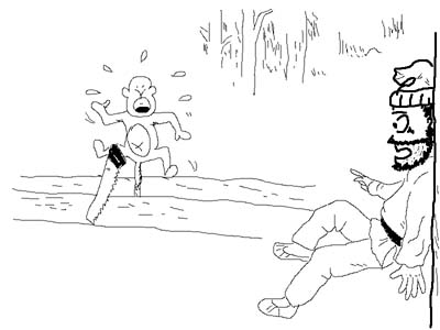 一只猴子坐在一棵樹上看著他干這一切,心想:原來伐木如此簡單。