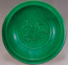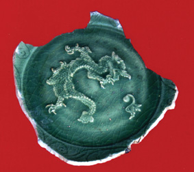 這塊殘瓷外腹壁刻菊瓣紋,內(nèi)心坦底貼雕龍頭鳳尾紋及繡球,蒼龍及繡球皆系同瓷盤坯泥片堆貼后,作雕、刻、劃、剔等,使紋飾高于胎體,掛釉后營(yíng)造了紋飾玉質(zhì)釉彩下,映現(xiàn)出浮雕效應(yīng),燒成之器物清純流翠、釉色瑩潤(rùn)、紋飾俏麗。