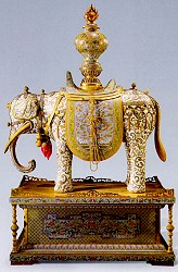 此琺瑯象通體銅胎鍍金。象四足直立,卷鼻垂尾,背負鞍墊及寶瓶,寓意"太平有象"。下設帶欄束腰長方座。瓶、象、座均鏨飾勾云及纏枝花卉紋,填彩色琺瑯釉。墊左右飾云龍紋,是用掐絲琺瑯做成。此象為佛堂供器,共兩件,它是其中之一。廣州制造,于乾隆十一生(1746)由兩廣總督李侍堯貢奉。